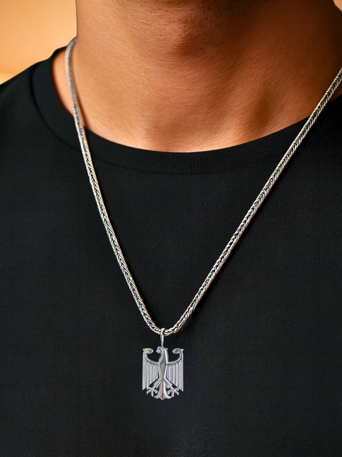 Die Kette wird aus massivem 316L Edelstahl gefertigt. Dieses Material ist besonders robust, rostfrei und hautfreundlich – ideal für den täglichen Gebrauch. Anschließend wird die Oberfläche mit Silber veredelt, um den charakteristischen Glanz zu erzielen.